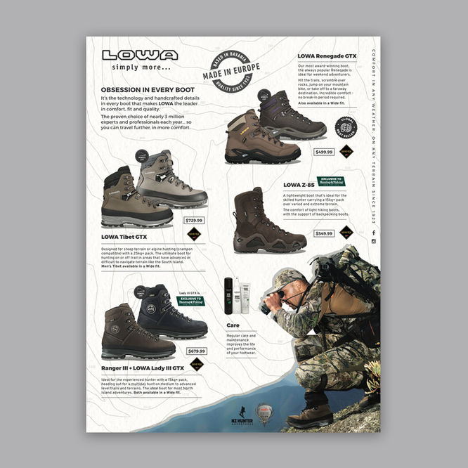 LOWA (pronounced LO-VA) offer a range of exceptional footwear hand-stitched and designed in Germany for over 100 years. Woo emulated that precision and love of detail in their comms.